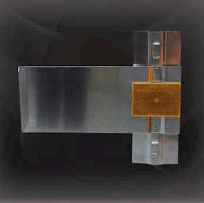 DELINEATORE PER GALLERIA 4A su piedritti galleria realizzato in alluminio spessore 30/10. Fissato mediante tre tasselli in gomma con vite autofilettante (dimensione vite mm 35×6). Dotato di 2 catarifrangenti cm 10×15 arancioni fissati con attacco a baionetta.